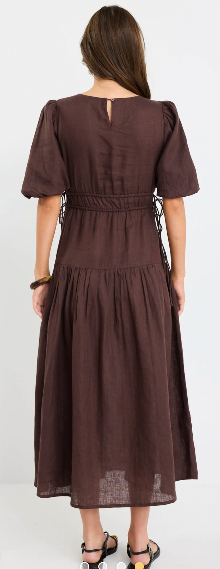 The Glory chocolate midi dress from Among The Brave is a timeless piece designed for effortless elegance. Its puff sleeves and tiered skirt create soft movement, while the delicate tie details cinch the waist for a flattering silhouette. Crafted from 100% linen, this natural fibre beauty is breathable, durable, and perfect for versatile styling across seasons.